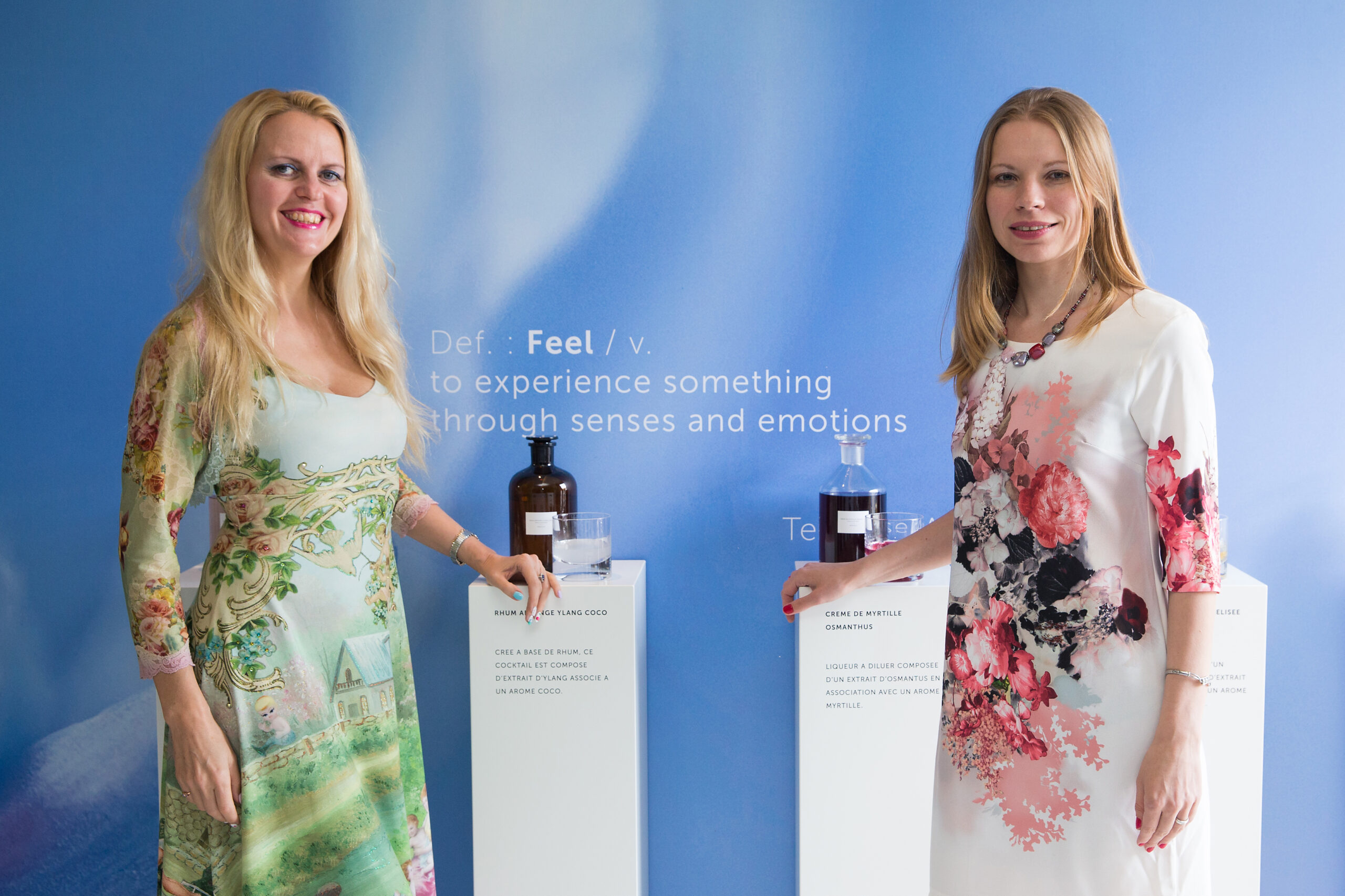 Владислава Кочелаева, российский парфюмер, и её переводчик перед стендом парижской осмотеки